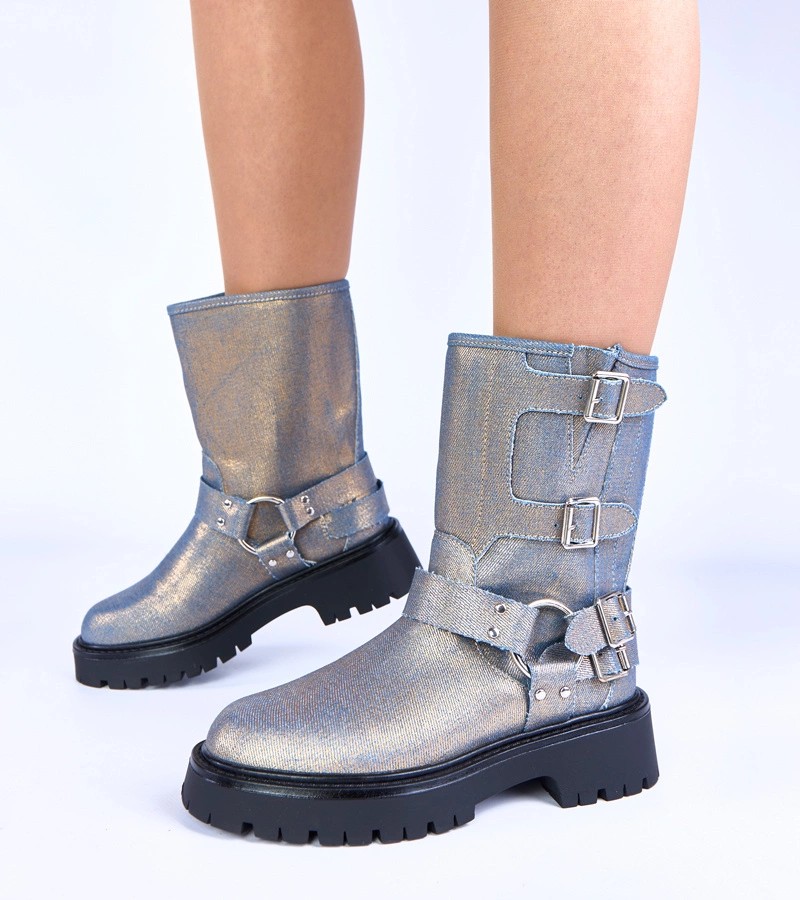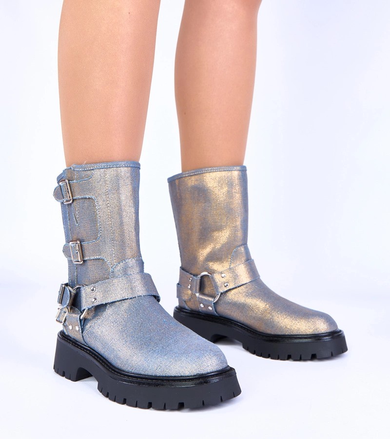 Mėlyni batai, puošti sagtimis su auksiniu blizgesiu Cara