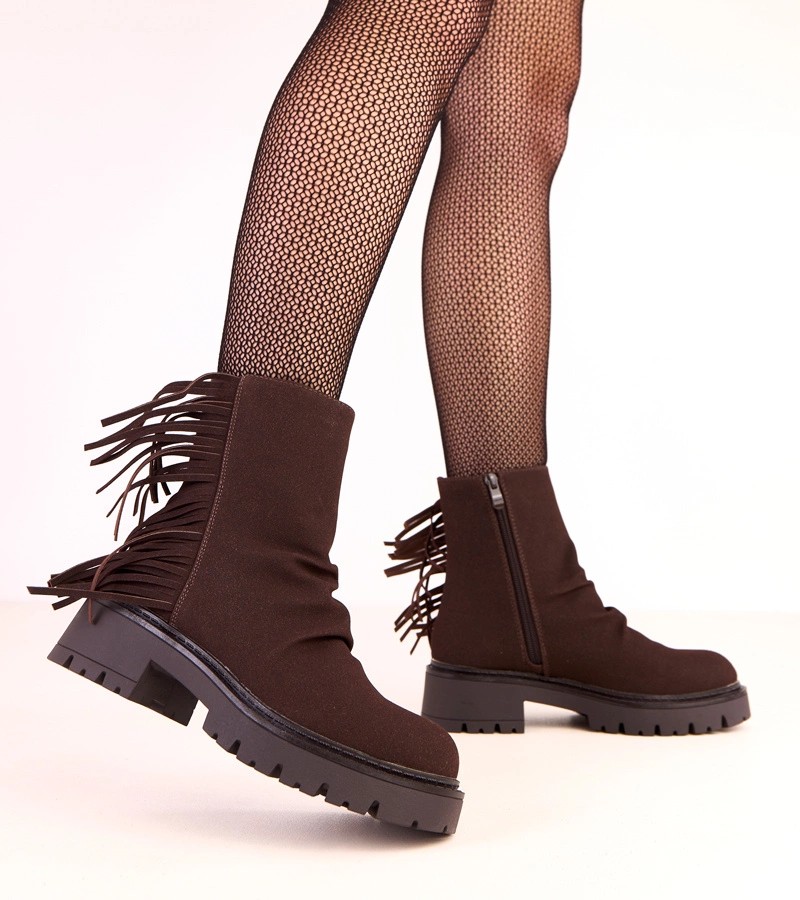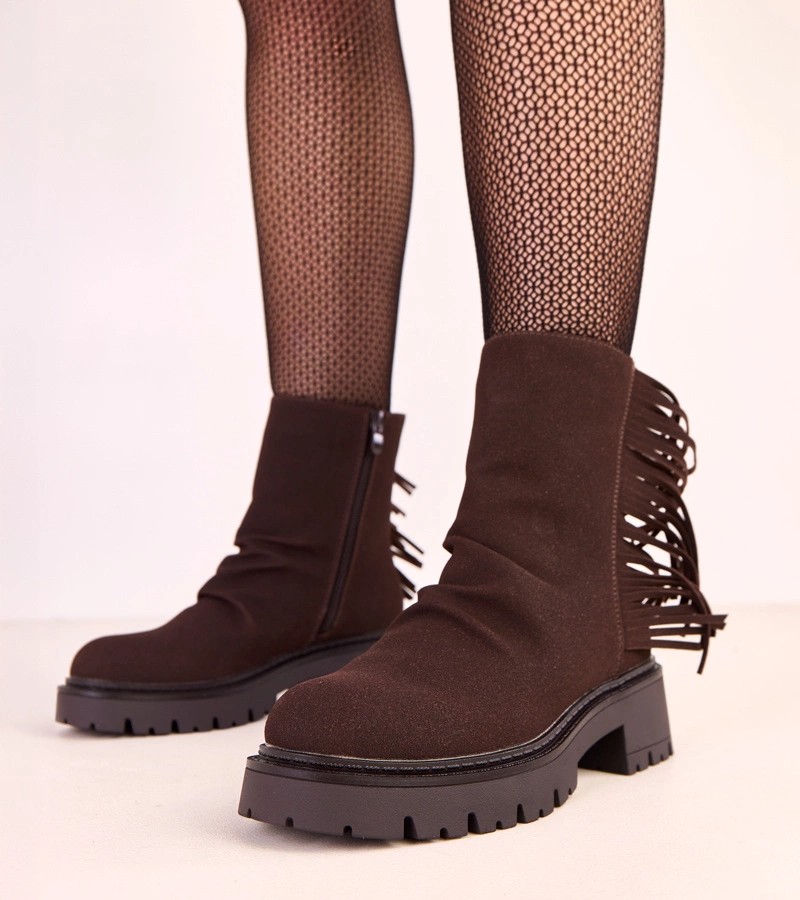 "Silia" šokoladiniai batai su kutais ant grubaus pado - puikus pasirinkimas moterims, kurios vertina patogumo, madingo dizaino ir universalaus stiliaus derinį. Šie stilingi tamsiai šokolado atspalvio moteriški batai puikiai atitinka dabartines tendencijas ir puikiai papildo tiek kasdienį, tiek elegantiškesnį stilių. Išraiškingi kutai suteikia boho stiliaus akcentą, o storas padas užtikrina stabilumą ir dėvėjimo patogumą visą dieną.