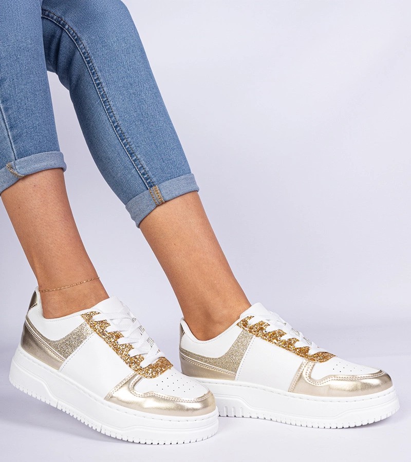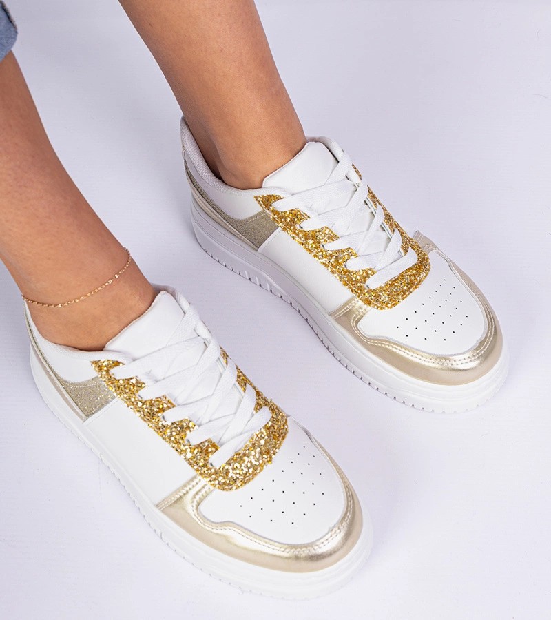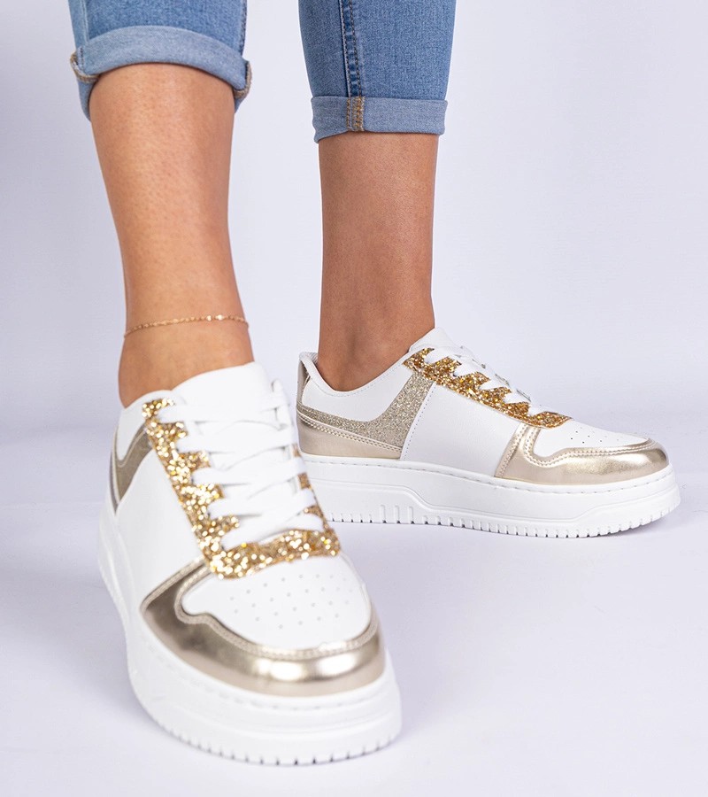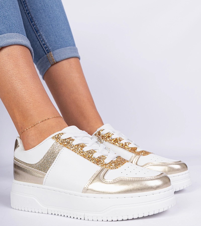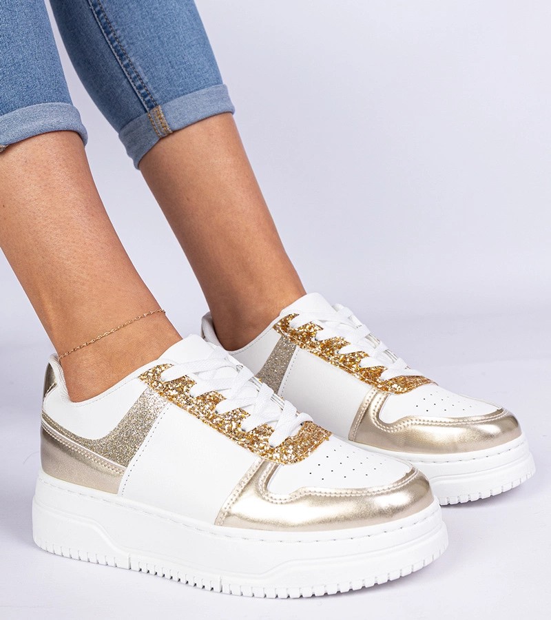 Auksiniai moteriški sportbačiai storu padu, dekoruoti blizgučiais Dolla