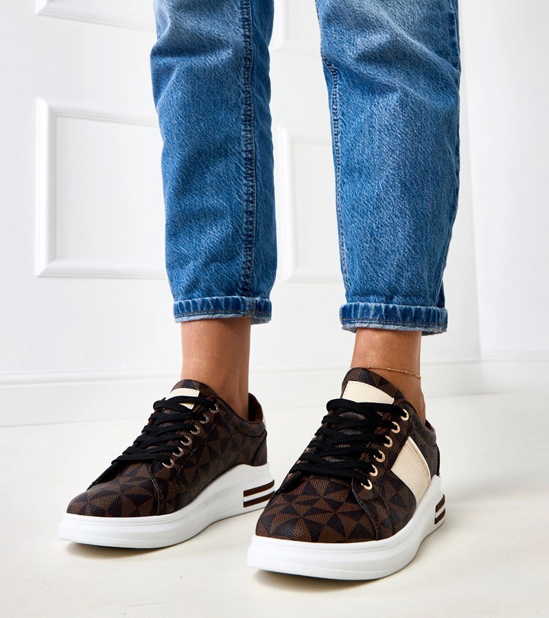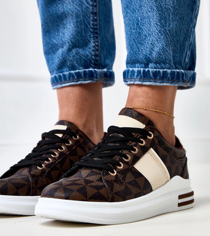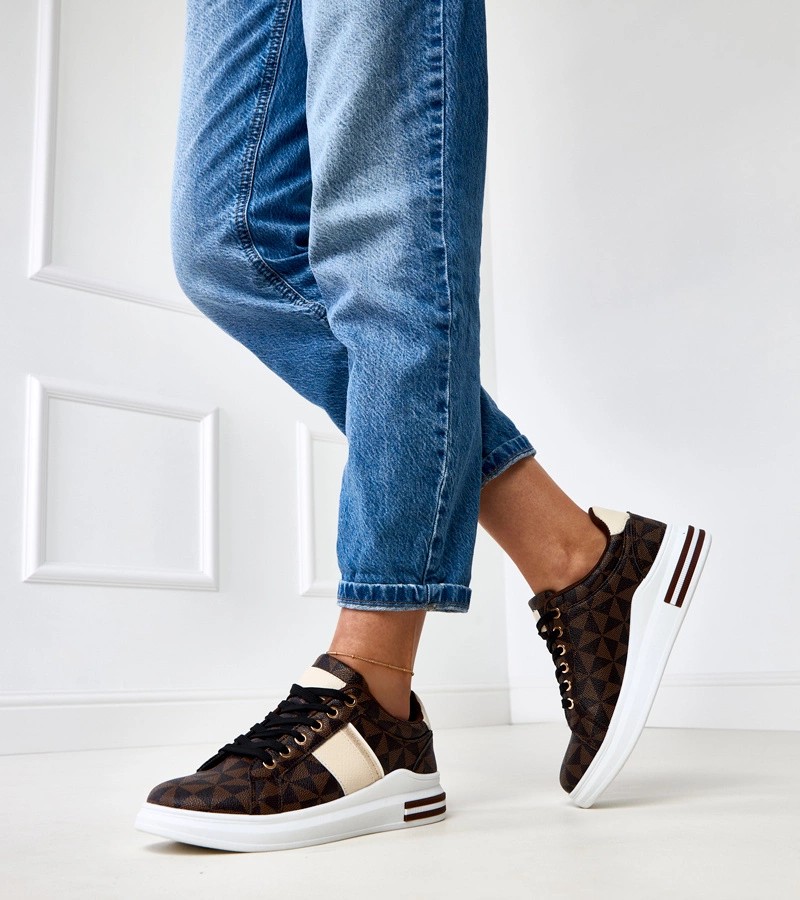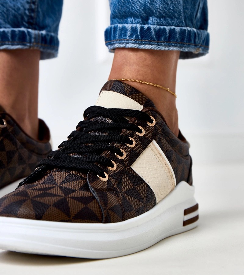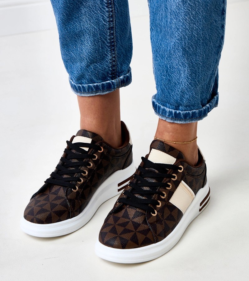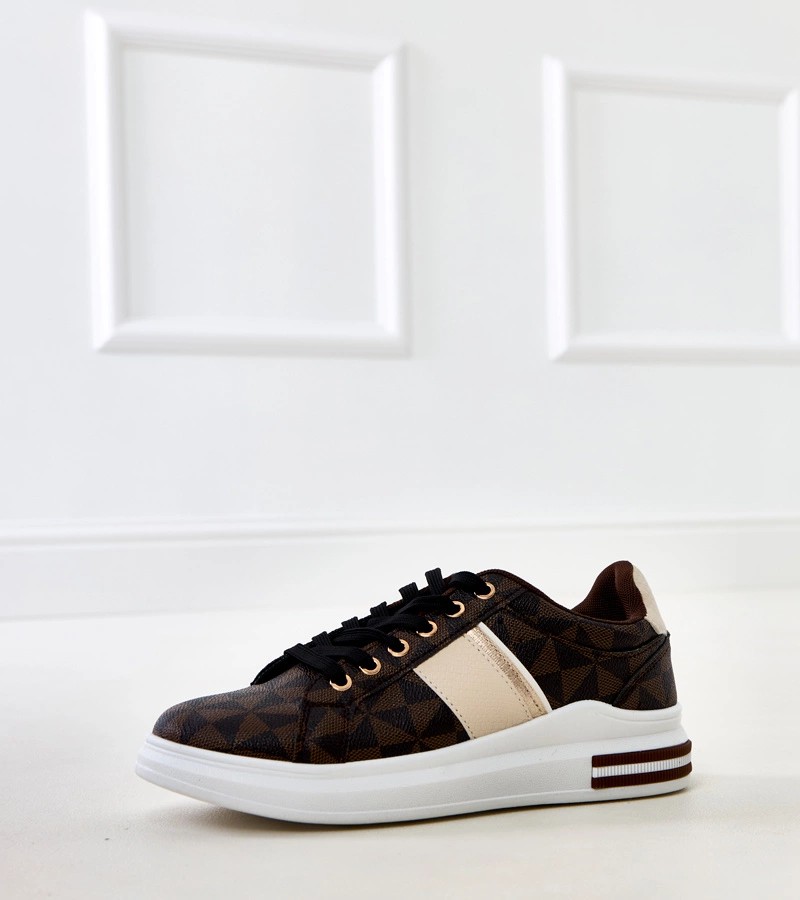 Mūsų platforminiai sportbačiai sujungia klasikinį dizainą su moderniu akcentu. Dėl rudos spalvos jie tinka prie daugelio aprangos detalių, o smėlio spalvos ir auksinis dirželis suteikia elegantiškumo ir išskirtinumo. Pagaminti iš aukštos kokybės medžiagų, jie garantuoja patvarumą ir patogumą nešiojant visą dieną.