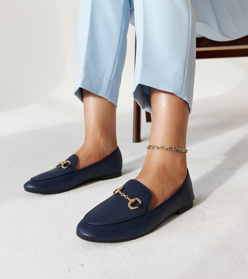 Tamsiai mėlyni Erminia mokasinai su sagtimis - puiki avalynė karštomis vasaros dienomis. Dėl migdolinių pirštų ir žemo plokščio dizaino jie ne tik patogūs, bet ir labai elegantiški. Dėl įsispiriamos konstrukcijos juos galima revoliucingai ir lengvai apsiauti. Pagaminti iš plastiko, jie užtikrina ilgaamžiškumą ir patogumą visą dieną.