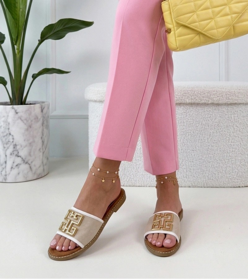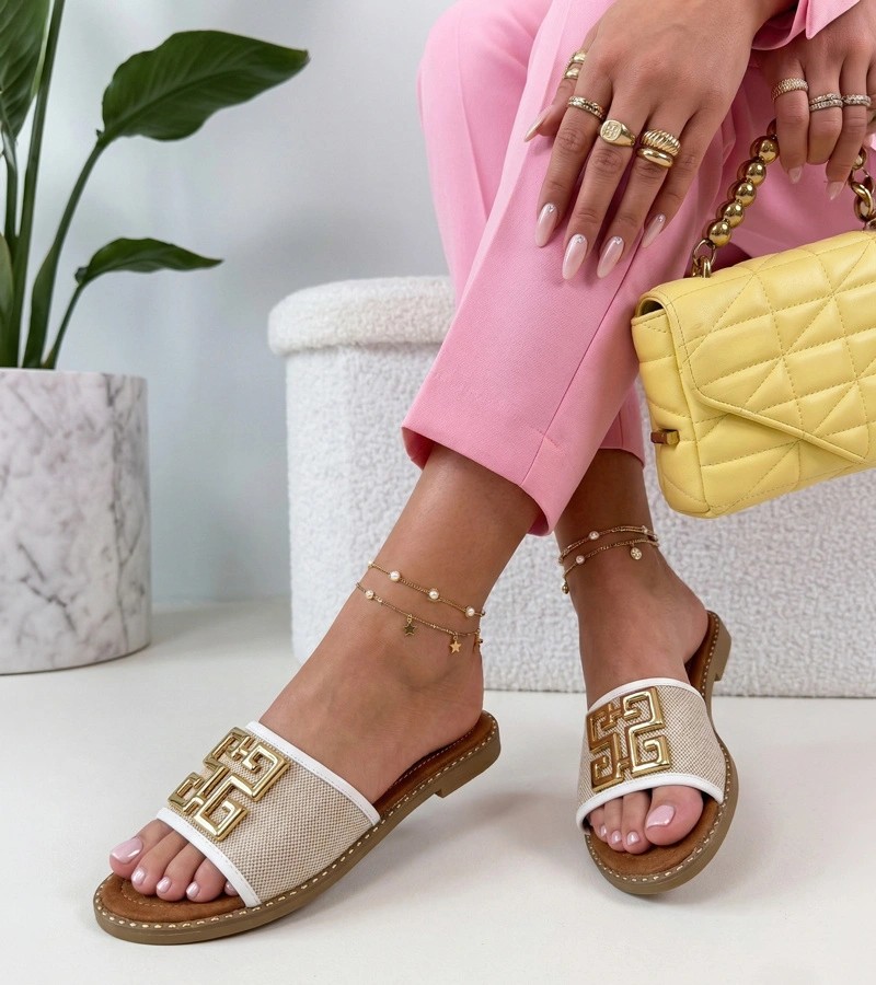 Baltos šlepetės, dekoruotos auksine Juliette sagtimi