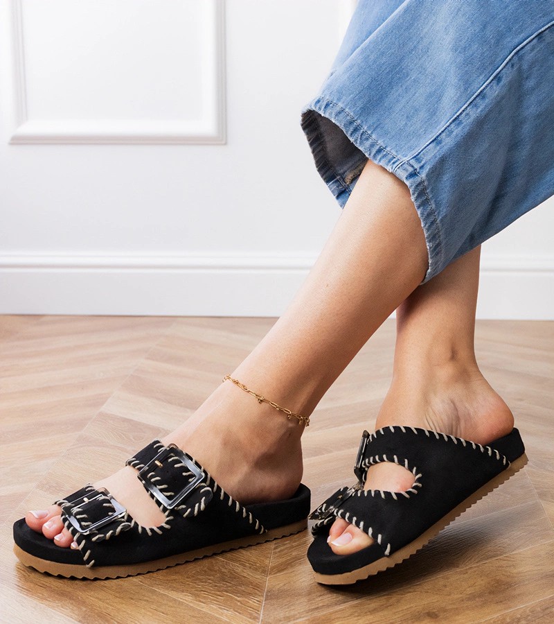 Juodos šlepetės su sagtimis ir siuvinėjimu ant Kim dirželių