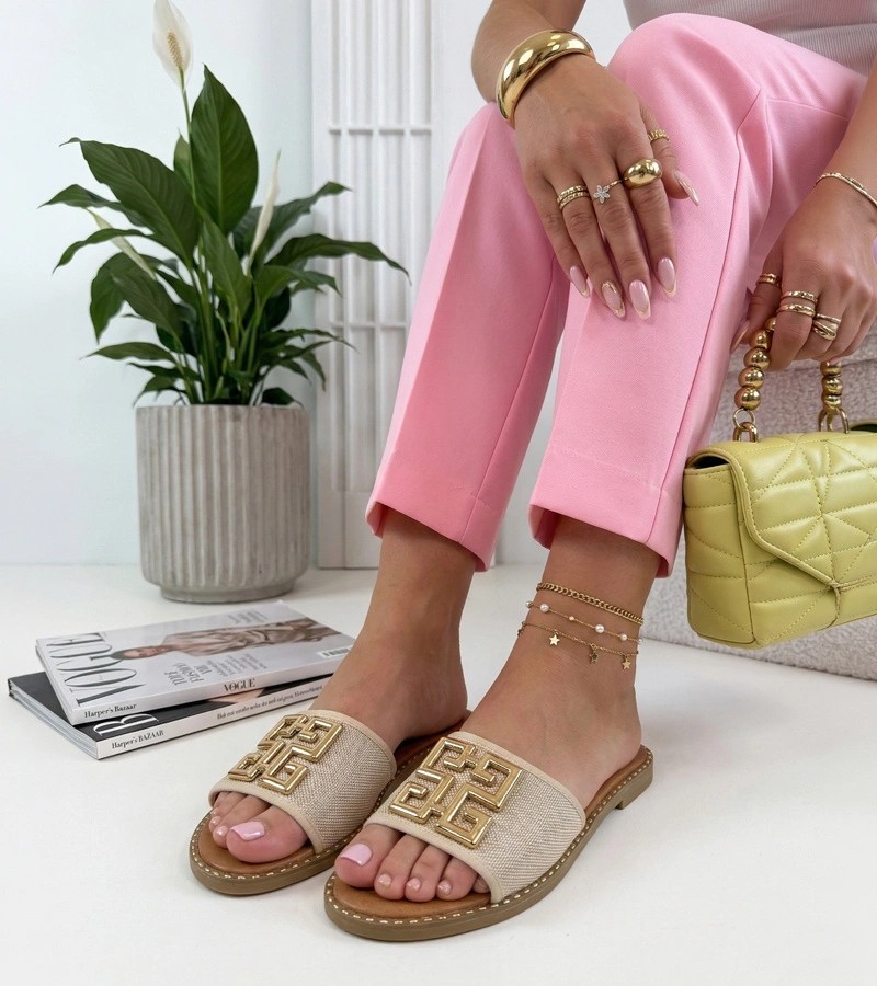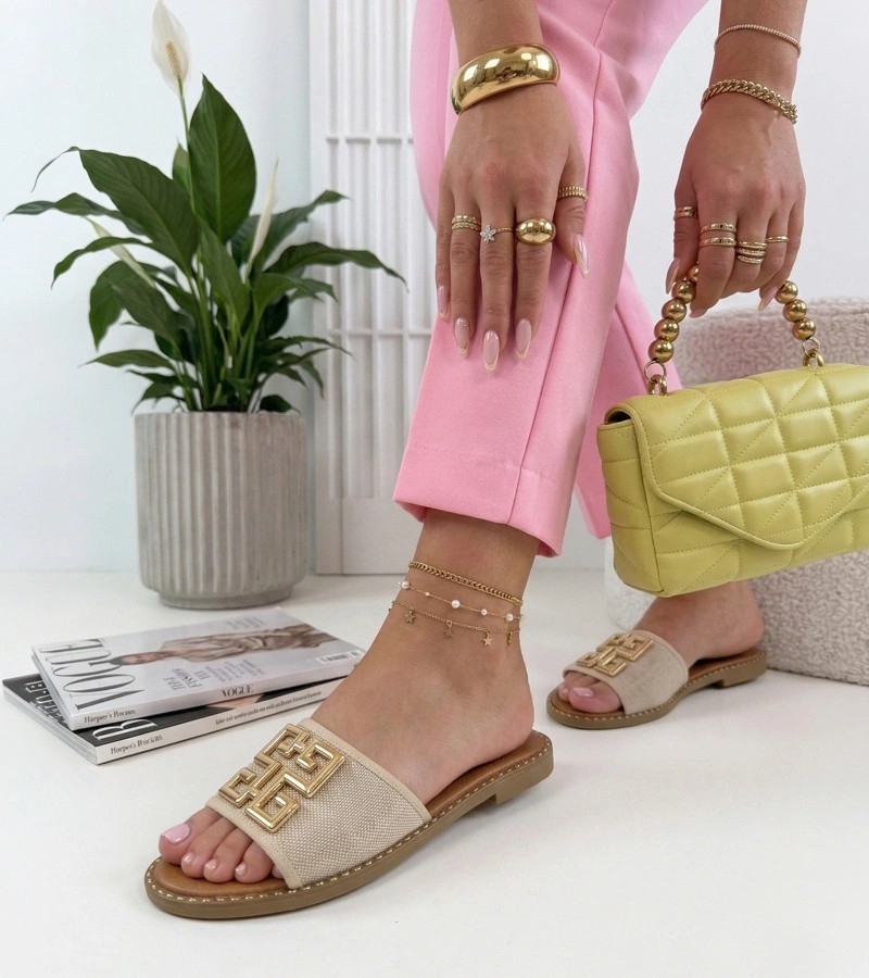 Smėlio spalvos šlepetės su auksine Juliette sagtimi